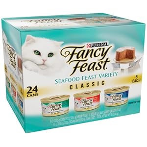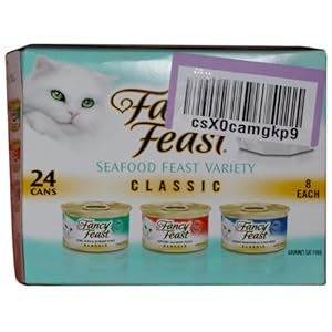 Fancy feast gourmet cat food is a 24 count can containing flavors of ocean white fish and tuna feast, savory salmon feast and cod, sole and shrimp feast. All these flavors are formulated to meet nutritional levels established by the AAFCO Cat Food Nutrient Profiles for all life stages.