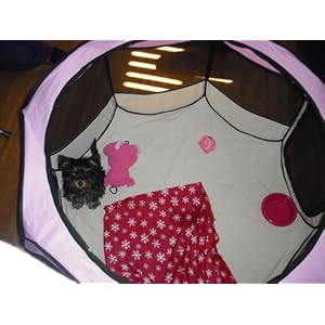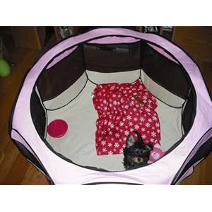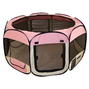 Whether inside or outside the Best Pet Soft Sided Play Pen is the answer for a play pen for that is quick and easy to set up. It is excellent for travel because it sets up in seconds yet folds easily and stores in a carrying case that is just 24" by 19" by 2" thick. This water-resistant play pen works well inside or out and is especially useful for sick or expecting pets that need to be confined. Setup is easy, simply unfolds in seconds with out any tools. For outdoor use you can use the included ground stakes to secure the play pen to the ground. Because it completely encloses your pet another use for this playpen is for sunning reptiles. It has side pockets for convenient storage of small items. The play pen measures 43 inches in diameter by x 22 1/2 inches high. Available in burgundy and cream, blue and cream, pink & cream, teal and cream, blue plaid, pink plaid, leopard skin, zebra skin, and camouflage colors. To see the other color choices along with all of our other products click the Best Pet link under the product title and just to the right of the picture.