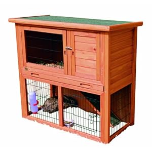 The large TRIXIE 2-Story Natura Rabbit Retreat is ideal for outdoor use. Solid wood construction, finest materials, and glazed pine finish mean this attractive hutch will endure years of use with very little maintenance. The two-story design allows your pet to roam inside and outside, upstairs and downstairs, in the sun or in the shade for ideal comfort. However, the non-slip ramp and interior hatch door give the owner options to restrict access as needed. The durable, powder-coated metal lattice and lockable hatch will help keep your pet safe while keeping out unwanted visitors. The hinged roof has a special weatherproof coating and can be completely opened from the top for additional accessibility, and the plastic pull-out tray allows for easy maintenance. Two front doors also make helping your pet in and out of the hutch far simpler. Wood panel at the back offers additional protection from the elements. Suitable for small animals such as rabbits and guinea pigs. Winter and weatherproof. Quick and easy assembly. One year warranty. Dimension: 41 x 20 x 39 in. Weight: 55 lbs. Color: glazed pine. Please note: water bottle and bowl in picture are not included.