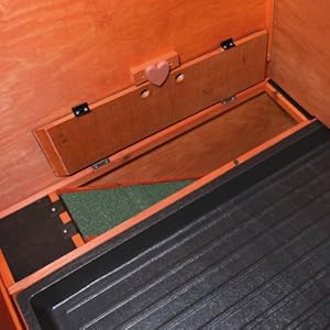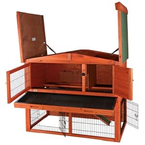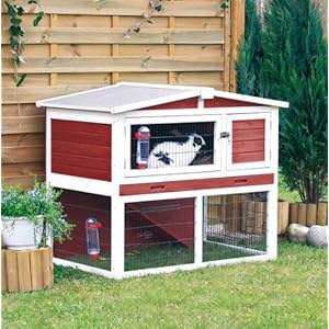 TRIXIE’s Natura Rabbit Lodge (medium) is painted red with white trim, displaying the charm of an old-fashioned barn. It’s solid wood construction, finest materials, and weatherproof finish mean this attractive hutch will endure years of use with very little maintenance. The two-story design allows your pet to roam inside and outside, upstairs and downstairs, in the sun or in the shade for ideal comfort. However, the non-slip ramp and interior lockable hatch door give the owner options to restrict access as needed. The durable, powder-coated metal lattice and lockable hutch will help keep your pet safe while keeping out unwanted visitors, and the close mesh (0.8 in/2 cm) design makes it suitable for breeding. The pitched roof has a special weatherproof coating and the panels can open from the top on each side for additional accessibility. For easy maintenance, we have included one front and side door as well as a pull-out plastic tray. Wood panel at the back and at the sides of the enclosed area offers additional protection from the elements. Suitable for small animals such as rabbits and guinea pigs. Winter and weatherproof. Quick and easy assembly. One year warranty. Dimension: 48 x 38 x 30 in. Weight: 71 lbs. Color: red with white trim. Please note: water bottle and bowl in picture are not included.