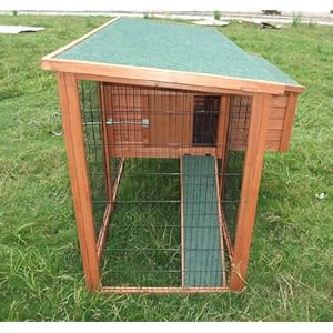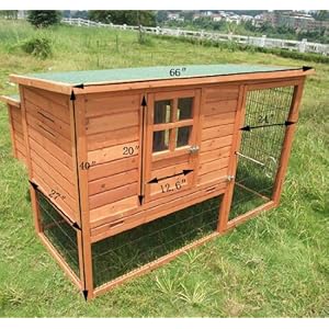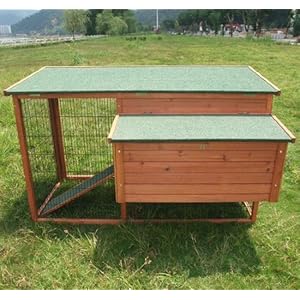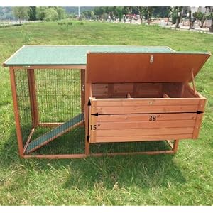 This is a high quality Large Chicken Coop which is made of fully treated and grooved wood. Coated with water based preservativ. Coming with a three section nesting box for egg laying. This coop can be wide opened to be a "fresh air school", and closed to make a controlled-environment coop. This coop is well designed with one Living House, a three section Nesting Box and a Backyard Run. - Chicken Coop, Nesting Box, and Run Backyard, all in one deluxe Chicken Coop. - Works great for rabbits, chickens, ducks, or other poultry. - Easily portable that allows you to move the coop throughout your landscape. - Heavy duty galvanized wire helps keep chickens in and predators out. - High strength screwed construction. - Special Designed Green WaterProof Roof. - The Window for better air condition. - Hinged Door for easy access for Cleaning, Refilling Food and Water. - Sliding Access Door with a Ramp for your Chickens to Get in and out. - Large side located Nesting Box. - Removable Dividers to make the Nest Box into 3 nest areas. - Hinged Nest Box Lid to Collect the Eggs. - Slide out droppings tray, makes cleaning easy. - Some Assembly is needed. - Overall Size:66" L x 43.5 " W x 40 " H - Holds up to 6-8 Bantams or 3-5 Standard Hens.
