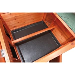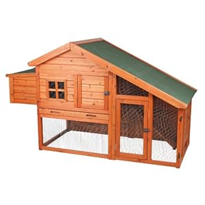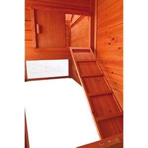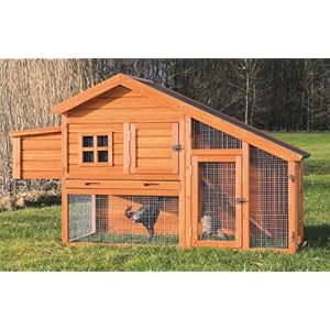 Raising chickens can be a fun and rewarding experience for any backyard farmer. They produce nutritious eggs, as well as organic fertilizer, and are low-cost pets to maintain. Because chickens need room to roam and stretch their wings while still feeling safe, trixie's chicken coop with a view is ideal for these lively companions. The charming 2-storey design allows your flock to roam inside and outside, upstairs and downstairs, in the sun or in the shade for ideal comfort. However, the sliding door at the top of the ramp allows for restricted access as needed. Upstairs features a sleeping house with a removable roosting pole and pull-out plastic tray for easy maintenance. It connects to a large nesting box which can be converted into 2 separate boxes by inserting our removable divider. Both the coop and nesting box have a hinged roof with locking arm that opens from above for easy access. The close-mesh galvanized metal grid and metal slide latches protect your flock from predators, while the back wood panel shields them from the wind while they stretch, peck and flap. Solid wood construction, galvanized metal, composite asphalt shingles and a weatherproof finish means this coop will endure years of use with very little maintenance. Suitable for up to 2 standard size chickens or 4 bantams. Compatible with trixie's natura outdoor run with mesh cover item 55965. One year warranty. Color glazed pine. Dimensions 69 by 31 by 42-Inch, mesh door opening 12 by 22-Inch, wood door opening 12 by 12-Inch. Weight 79-pound.