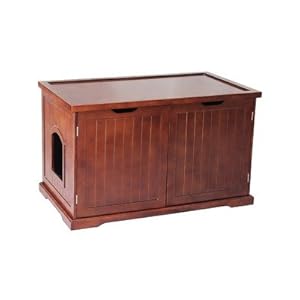 This cat washroom bench serves as an attractive cover to hide away the litter box and confines all the litter mess inside, while providing useful space for many organizing options. It is designed to fit any size litter box, including the extra-large automatic litter boxes. It comes with a removable partition wall creating a space to store litter, scoop and other supplies. The entrance to the cat washroom bench can be placed on either side of the unit to suit the room it is used in. Door measurement: 7-inch w by 8-inch h. Minimal assembly required, instructions and hardware are included.